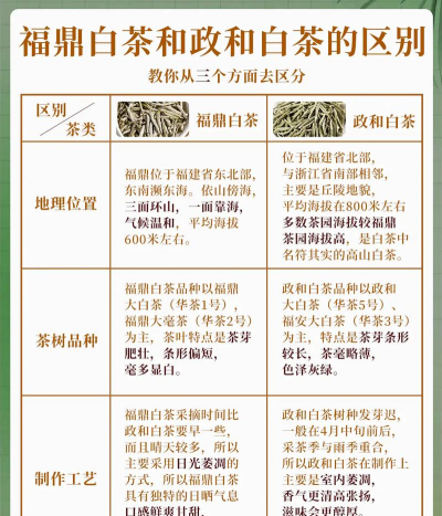 总结福鼎白茶与政和白茶的差异主要源于产地、茶树品种、生长环境及制作工艺的不同。福鼎白茶以阳光味和花香著称,政和白茶则以高山韵和甜润口感见长。选择时可根据偏好:若追求花香与毫香,可选福鼎;若偏好浓醇口感与山场风味,政和白茶更合适。
