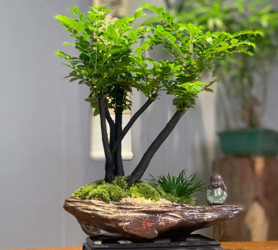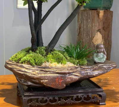 - 在盆底铺入排水层(如碎石或陶粒),填入配制好的土壤,将树桩放入并覆土压实。