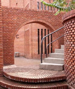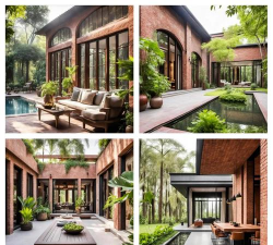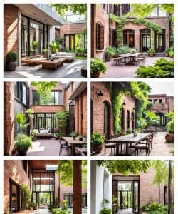 - 红砖建筑与自然元素结合,如斜铺红砖地面形成几何图案,搭配竹制家具和垂直绿化,营造生态氛围。