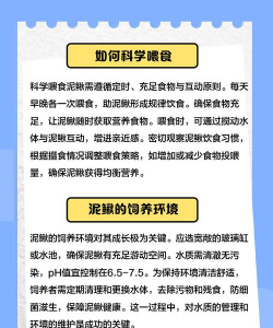 - 以动植物蛋白为主,搭配豆饼、米糠、蚯蚓等天然饵料,日投喂量占体重的4%-10%。 - 饲养成鳅后减少动物性饲料,避免消化不良。