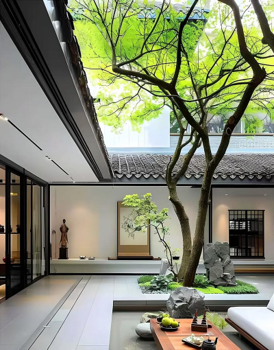 注重空间隔离与隐私保护,通过影壁、曲径设计营造静谧氛围。例如中式别墅前庭设置半遮半掩的屏风墙。