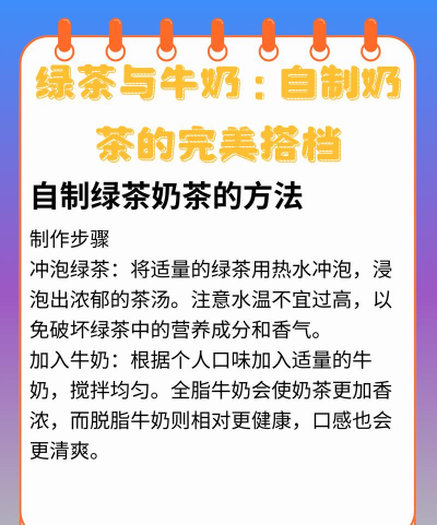 绿茶 可以用来做奶茶。绿茶与奶茶的结合是一种创新的饮品体验,它融合了绿茶的清新香气和奶茶的浓郁口感。以下是制作绿茶奶茶的一些方法和建议: