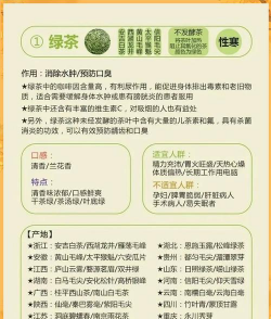 营养成分绿茶:富含儿茶素、氨基酸、维生素C等营养成分,有清香、清爽、回甘的特点,适宜清热解毒、提神醒脑。