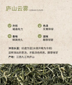 庐山云雾茶:产于江西庐山,茶叶条索紧结,色泽翠绿,香气浓郁,口感鲜爽。