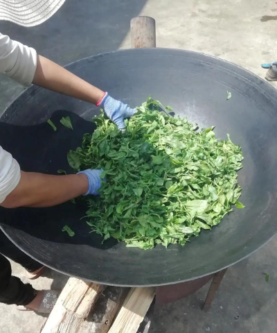 摊青:将采摘好的茶芽均匀铺在竹筛上,使其摊凉。这一过程有助于增强酶的活性,散发部分青草气,为后续炒制打下基础。摊青时间一般为7~8小时,或者在薄摊在阳光下晒20~25分钟,然后移入室内晾青,直至叶片变为暗绿为宜。