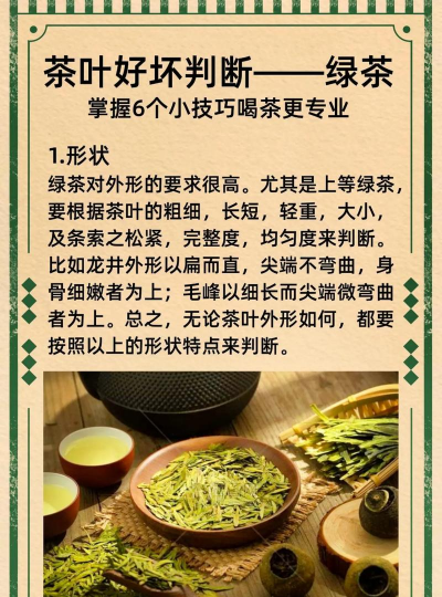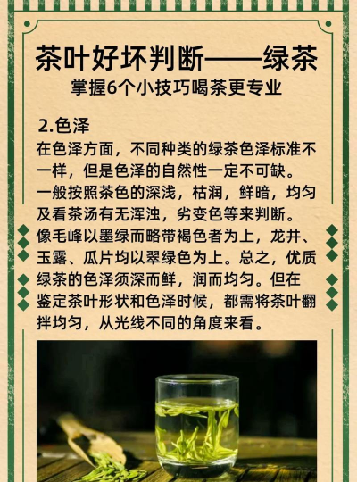通过上述几个方面的综合判断,可以较为准确地鉴别绿茶的好坏。建议在购买绿茶时,从多个角度进行细致观察和品尝,以确保选购到优质的茶叶。