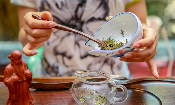 用茶匙将茶叶轻轻投放到冰清玉洁的玻璃杯中,如同迎接佳人。