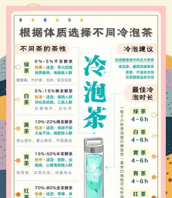 将茶叶放入冰箱冷藏浸泡6-12小时,绿茶和花茶浸泡时间可短一些(6小时),乌龙茶和黑茶可稍长(10小时以上)。