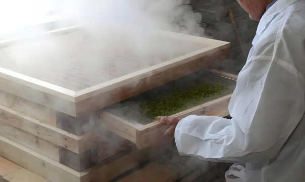 蒸制:将揉捻好的茶叶放入蒸制室中进行蒸制,蒸制室内温度控制在80至85摄氏度之间,蒸制时间根据茶叶的嫩度和湿度不同而有所差别。