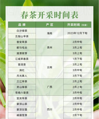 夏季采摘时间:一些地区也会在夏季进行第二次的绿茶采摘,主要是在6月至7月之间,但这次采摘的茶叶口感相对较苦涩,适合用来制作绿茶粉等加工产品。