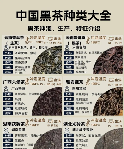 黑茶作为中国六大茶类之一,品种丰富且地域特色鲜明。根据搜索结果,黑茶主要品种可分为以下几类: