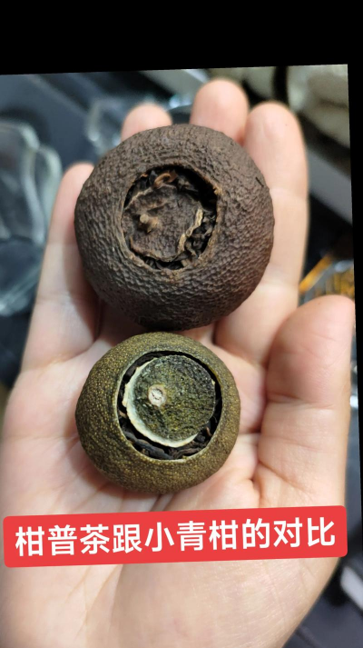 :小青柑茶需将青柑与普洱茶结合后发酵,陈皮普洱则是红柑与普洱茶混合陈化。