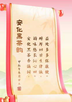 - "雪峰藏古韵,渥火淬玄霜。驼马摇铃响,三茶润世桑"(五绝·安化黑茶)。