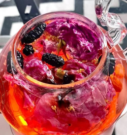 基础茶底:按基础款煮制,加入红枣、枸杞和桂圆干。2. 温润口感:用养生壶煮制时,水开后转小火焖泡10-15分钟,避免破坏花青素。3. 调味与饮用:滤出茶汤,加入蜂蜜调味,可搭配牛奶或冰块饮用。