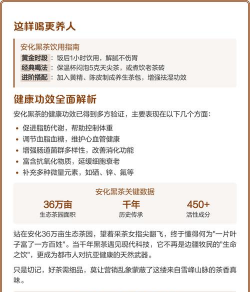 安化黑茶通过茶多酚、茶黄素等成分的协同作用,实现降脂减肥、抗氧化、调节胃肠、增强免疫力等多重功效,适合大部分人群饮用,但需注意禁忌(如发烧、溃疡患者)。