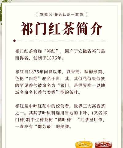 祁门红茶,简称“祁红”,是中国十大名茶之一,产自安徽省黄山市祁门县及其周边地区。它以独特的“祁门香”闻名于世,是世界三大高香红茶之一(另外两种是印度的大吉岭红茶和斯里兰卡的乌瓦红茶)。