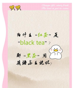 Black tea(红茶)并不是指茶的颜色是黑色,而是因为茶叶在加工过程中经过发酵,颜色变深,所以称为“black”。