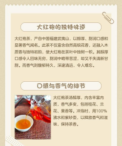 大红袍是一种享有盛誉的中国岩茶,以其独特的香气和口感而著称。以下是对大红袍味道的描述:
