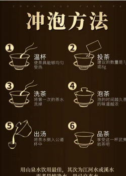 浸泡时间:冲泡时间根据个人口味和茶叶品质进行调整,一般第一泡在10秒左右,第二泡在30秒左右,第三泡50秒左右,优质武夷岩茶可以冲泡六次以上。