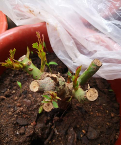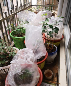 - 将月季扦插苗或老桩月季包裹在透明塑料袋中,扎几个透气孔,保持湿润环境20天左右,可促进生根。