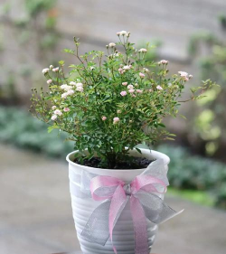 养护超微月季盆栽的时候就是注意经常浇水施肥,它的开花量很多,对肥水的要求也是比较高的。