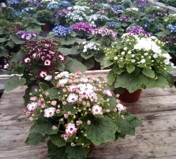 瓜叶菊的株形饱满,开花时就是郁葱葱的花球,花色迷人,花色特丰富,有常见的红色、紫色、粉色、蓝色、白色和各种混色的品种,最显眼的特征就是花瓣中心处有各种环形的斑纹和斑点,花瓣的背面甚至有绒光。