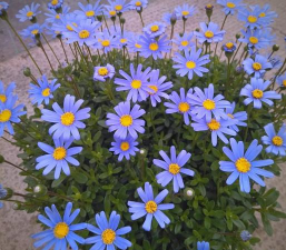 蓝玛的中文正式名叫:蓝菊,俗名叫费利菊,这是一种原产于南非海岸地区的一种观赏草花,在当地温润的气候环境下,一年的大半年以上都是在开花的,它也是非常古老的园艺观赏品种。
