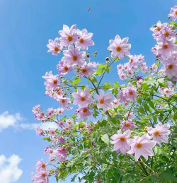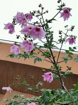 帝王大帝花(学名:Dahlia imperialis)的花朵都是粉红色的,花瓣有透明纸张般的质感,花色艳丽不俗气,花量特别丰富,一颗植株上就可以开出数百朵花。