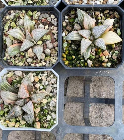 同类型的硬叶十二卷可以种同一个盆里,软叶系(牡丹卷属)的品种也是一样,甚至可以用来布置一个微型的植物景观。一般就选择植株形态差别比较大的品种,交叉种在一起可以在植株之间摆放一些石头,最好是选择一些土黄色或其他颜色比较浅的石头,还可以加入一两根浮木,就把这些十二卷属的多肉种在石头之间。
