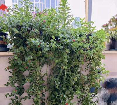 我把牡丹吊兰挂在阳台栏杆上,垂下来的枝条上次量了下,快有1米长了。它的叶子是肉质的,绿油油的特别饱满,开的玫红色小花像小灯笼似的挂在枝条上,花期一到,远远看去特别亮眼。