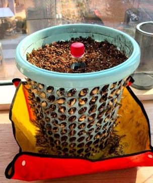4. 饮料瓶 :选比垃圾筐最高一排孔还高的,要是只种半筐,比土面高就行。瓶身上扎几个小孔,不同高度共扎四五个,方便浇水。