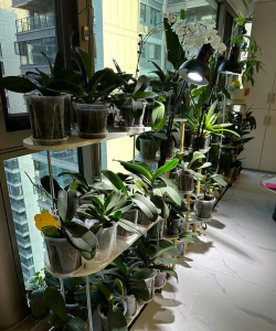 也能买多层折叠花架,不用时能收起来,展开后能摆十来盆小兰花,放在阳台角落,不挡走路还能晒到光。我邻居就这么弄,墙面挂一排,花架摆一角,三十多盆兰花也没显挤。