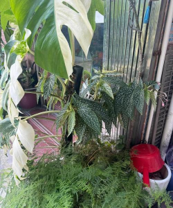 除了兰花,角落里还藏着白龟背竹和文竹,秋海棠的叶片泛着光泽,虽说看着有点挤,但每盆都长得精神,能看出主人花了不少心思。