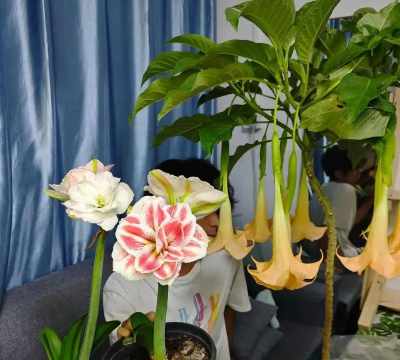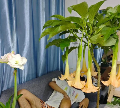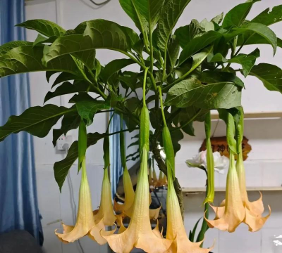 枝头挂满黄色的大喇叭花,一串一串的,颜色亮堂得晃眼,花香浓得飘满整个阳台。他赶紧搬进屋拍照发朋友圈,配文说“养了一年没白等,咋拍都出片,这花太绝了!”
