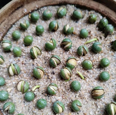 接着就能土培了,我用腐叶土、园土、珍珠岩按3:2:1混合,把带胚芽的种子埋进去(胚芽朝上),盖2厘米厚的土,浇透后放散光处。