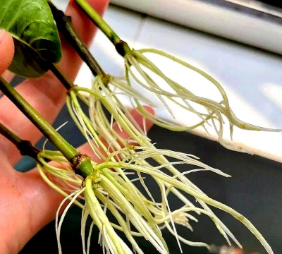单位剪鸭掌木时,我捡了几根枝条回来,去掉下部叶片,留上面几片,泡在水瓶里,水位五厘米左右,放在办公室角落,没管它,没想到三十天就长满了根,白白的根须从切口处蔓延开来,看着就有生命力。