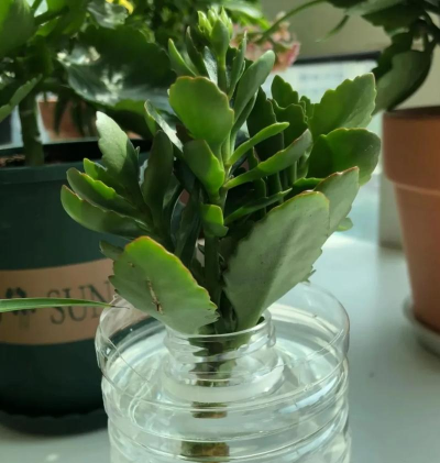 水培扦插很简单:选一段已经开过花的枝条,长度大概5厘米到8厘米就够了。把枝条底部的叶子摘掉,然后放在通风的地方,晾1到2小时,让伤口晾干,避免泡水烂掉。之后放进装水的瓶子里,不用放太多水,没过枝条底部就行。