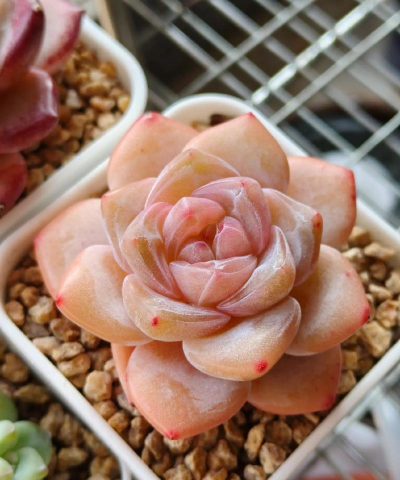 冰梅(Echeveria 'Iceberg'):叶片较薄,呈淡绿色或带有粉红调,有些品种会呈现橙色调。