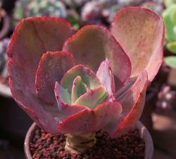 叶片:通常为粉红色或淡紫色,叶缘可能带有一些白色或浅粉色的边缘,叶片饱满,呈莲座状排列。