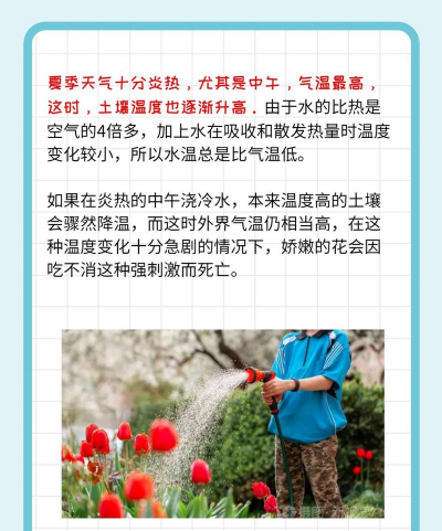 为了避免这些问题,建议在早晨或傍晚较凉爽的时候给植物浇水,这样可以让水分更充分地被植物吸收,同时避免上述问题