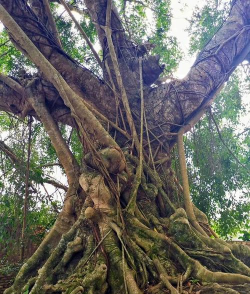 老榕树常有锈褐色的气根,向下伸入土壤形成新的树干,被称为“支柱根”。
