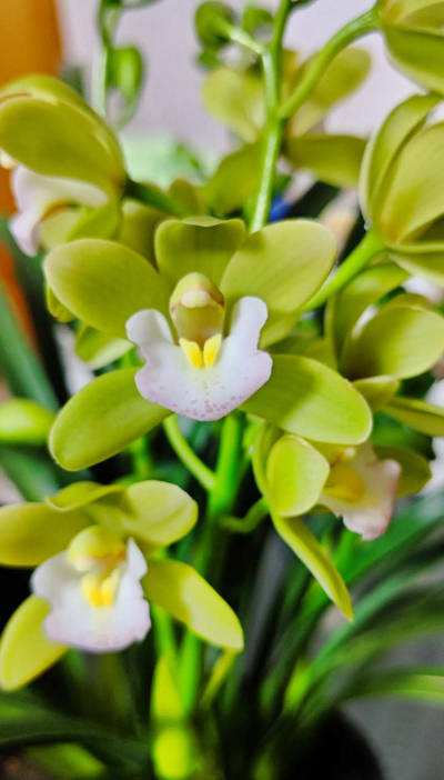 清雅脱俗,花色多为绿色和黄色,带红色,花香浓郁,叶片细长,边缘有细小的锯齿,花期在1-3月。