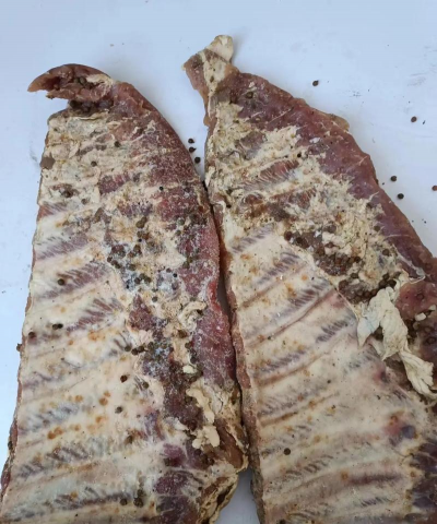 取出排骨,用勾子挂起来,在室内用风扇吹干,直至表面无水分。