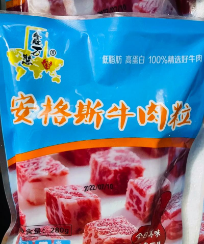 1. 蓝色包装的牛肉粒可能是某种品牌或产品的名称