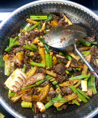 - 回锅底料,加入牛肉翻炒均匀,调入生抽、老抽、糖调味。