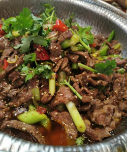 色泽:牛肉红亮,配菜鲜绿,酱汁红油浓郁。