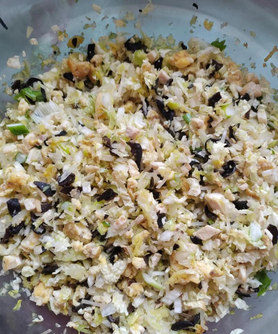挤干水分的白菜粒与豆腐丁、胡萝卜丁、粉条、葱花混合。