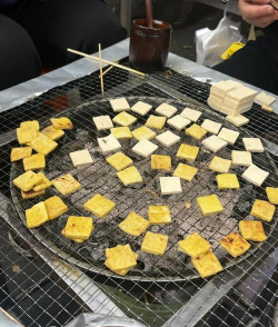 1. 白豆腐切成块,腌制1小时以上,期间可在表面刷点甜面酱。
