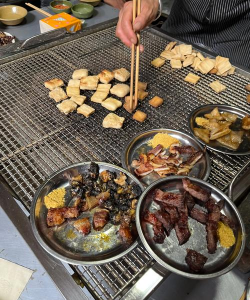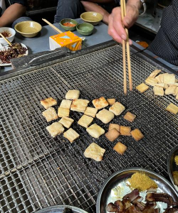 3. 豆腐抹上烧烤酱、生抽、蚝油,最后撒上烧烤料(孜然、辣椒面、盐等),腌半小时。