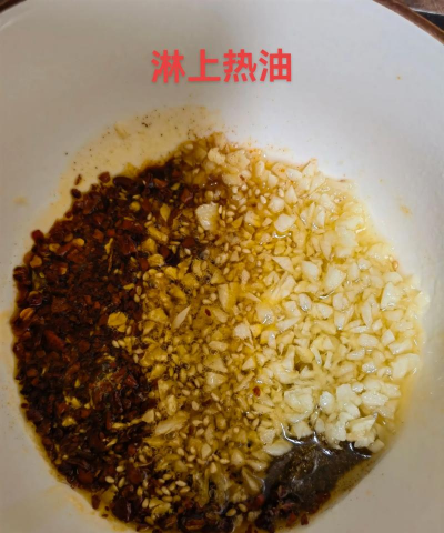 2. 姜、蒜、青椒、香菜茎、洋葱、小米辣放碗里,浇入一勺热油。